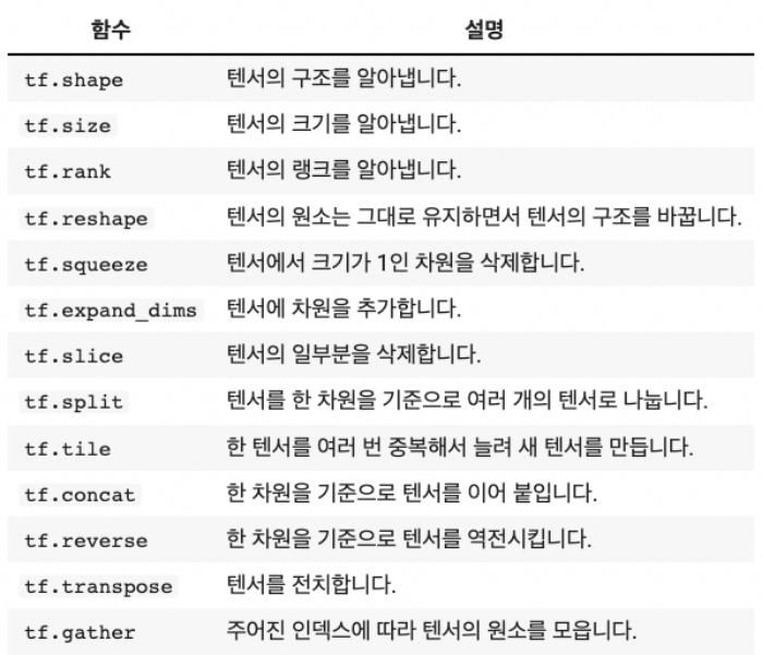 | tf.reshape(tensor, shape) | μ 체 μμ μλ₯Ό μ μ§ν μ± ν μ λͺ¨μ λ³κ²½ | tf.reshape([1,2,3,4,5,6], (2,3)) | 1μ°¨μ (6,) → 2μ°¨μ (2,3) |